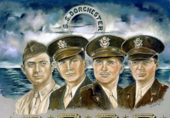Through the pandemonium, according to those present, four Army chaplains brought hope in despair, and light in darkness. Those chaplains were Lt. George L. Fox, Methodist; Lt. John P. Washington, Roman Catholic; Lt. Clark V. Poling, Reformed; and Lt. Alexander D. Goode, Jewish. Quickly and quietly the four chaplains spread out among the soldiers. There they tried to calm the frightened, tend the wounded, and guide the disoriented toward safety.